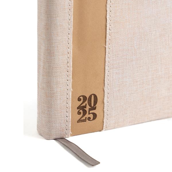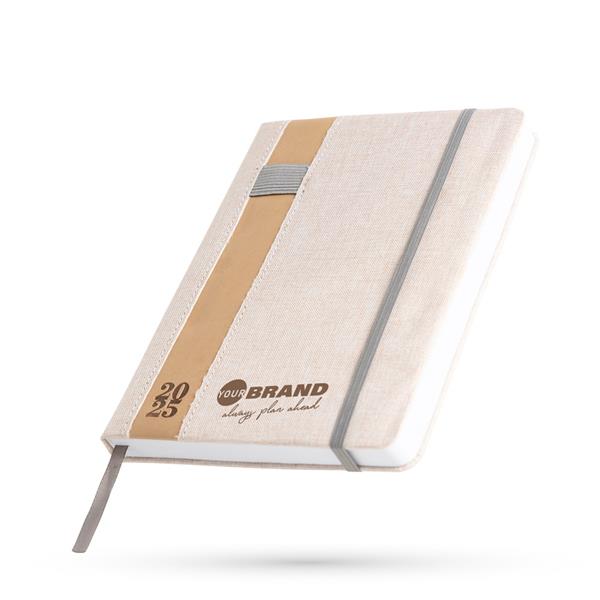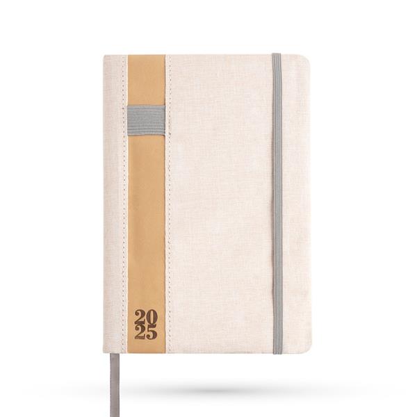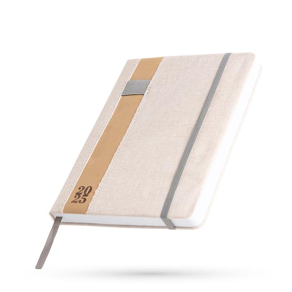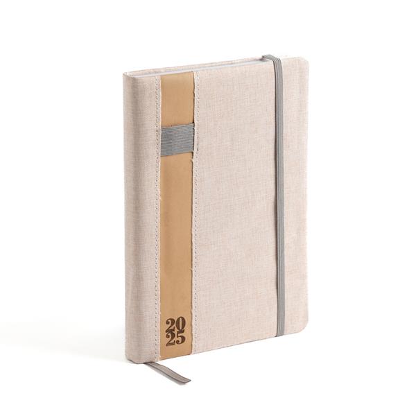Naples - Agenda diária A5. Capa em linho e PU com fitilho, elástico de fecho e suporte para esferográfica. Com 336 páginas, em papel branco 70gr e certificação FSC (papel proveniente de florestas geridas de forma responsável). Idioma principal: Português e Espanhol. No interior inclui: espaço para preenchimento de dados pessoais; calendários: 2024 e 2025; feriados em lista; plano de férias; Espaço para preenchimento de contactos importantes (de A-Z).