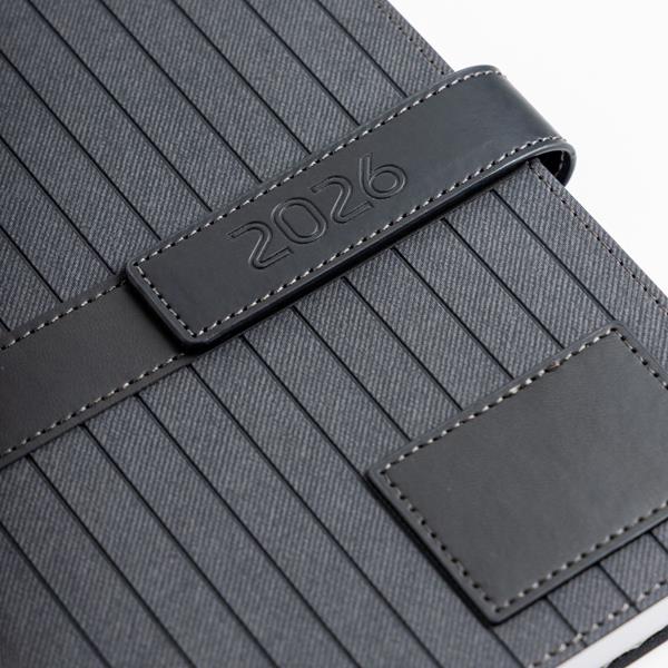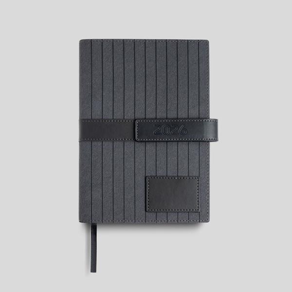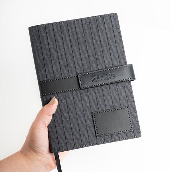 A Agenda Doha A5 é a escolha ideal para organização pessoal e profissional em 2026. Apresenta uma capa em PU texturada com fecho magnético, elegante e resistente, garantindo proteção e durabilidade. Inclui suporte para esferográfica, fitilho a condizer e um patch especial para personalização, tornando-a perfeita também como brinde ou presente corporativo.