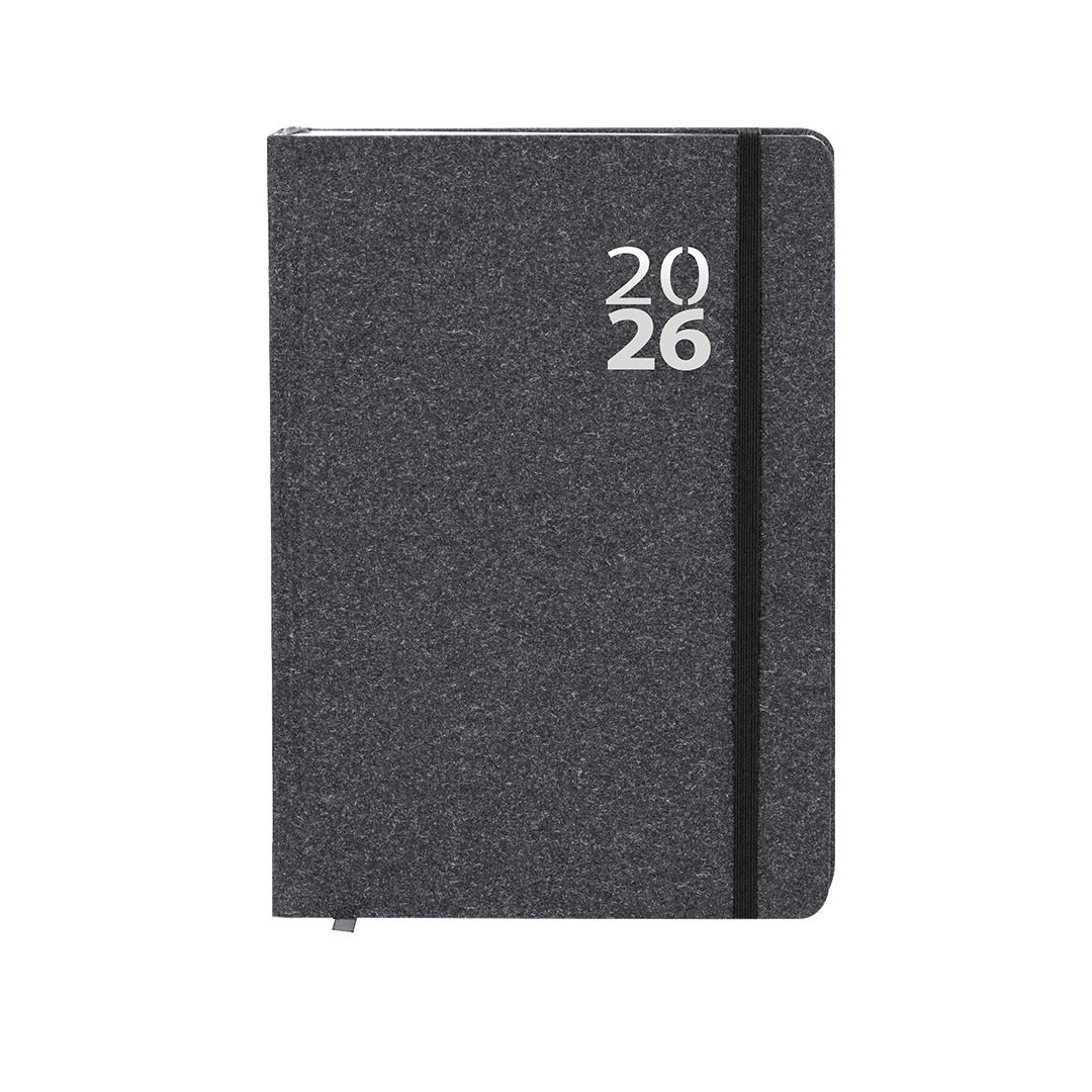 Apresenta design página por dia com zona de anotações e marca-páginas em tecido, ideal para o uso diário.