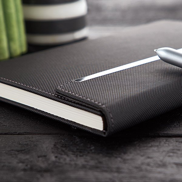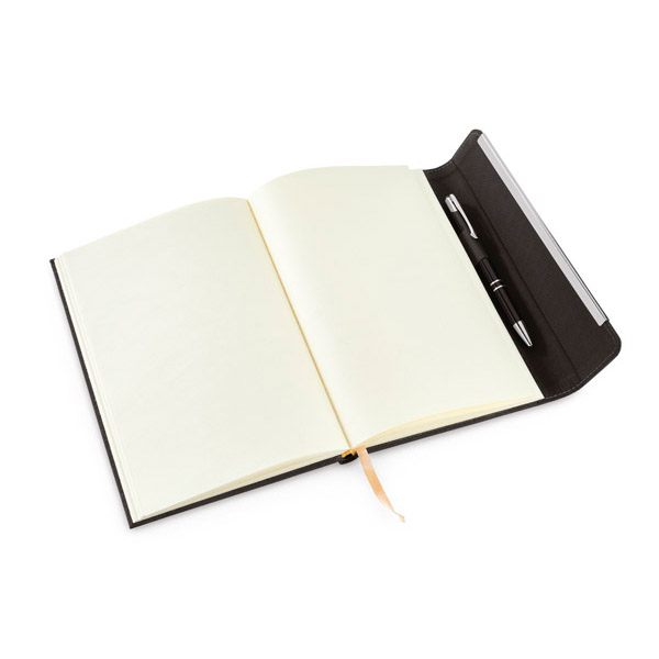 Bloco de notas A5 em imitação de pele, com capa rígida e fecho magnético. O bloco de notas contém suporte para esferográfica (não incluída) e 192 páginas lisas cor marfim.