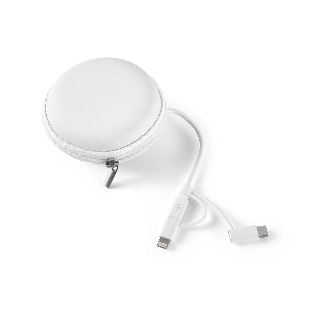 Cabo USB 3 em 1 que se adequa para carregar dispositivos móveis. Dispõe de um conetor micro USB e adaptadores Lightning® (com certificação MFI) e USB tipo C. Fornecido em bolsa de EVA.