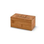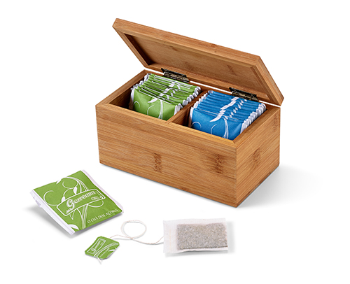 Caixa de chás, bambu, 2 compartimentos. Fecho com íman. Inclui 20 doses individuais de chá açoriano "Gorreana" (preto e verde).