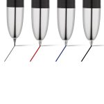 Esferográfica e lapiseira 4 em 1. Esferográfica e lapiseira em metal, com diferentes possibilidades de escrita: lapiseira, escrita a vermelho, azul e preto. Fornecido em estojo de oferta almofadado.