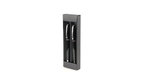 Conjunto de esferográfica com mecanismo rotativo e roller em design sóbrio. Corpo em alumínio com acabamento liso com acessórios nas cores prata. Apresentado em caixa de papelão individual com capa preta. Caneta esferográfica com cartucho jumbo. Em tinta azul.