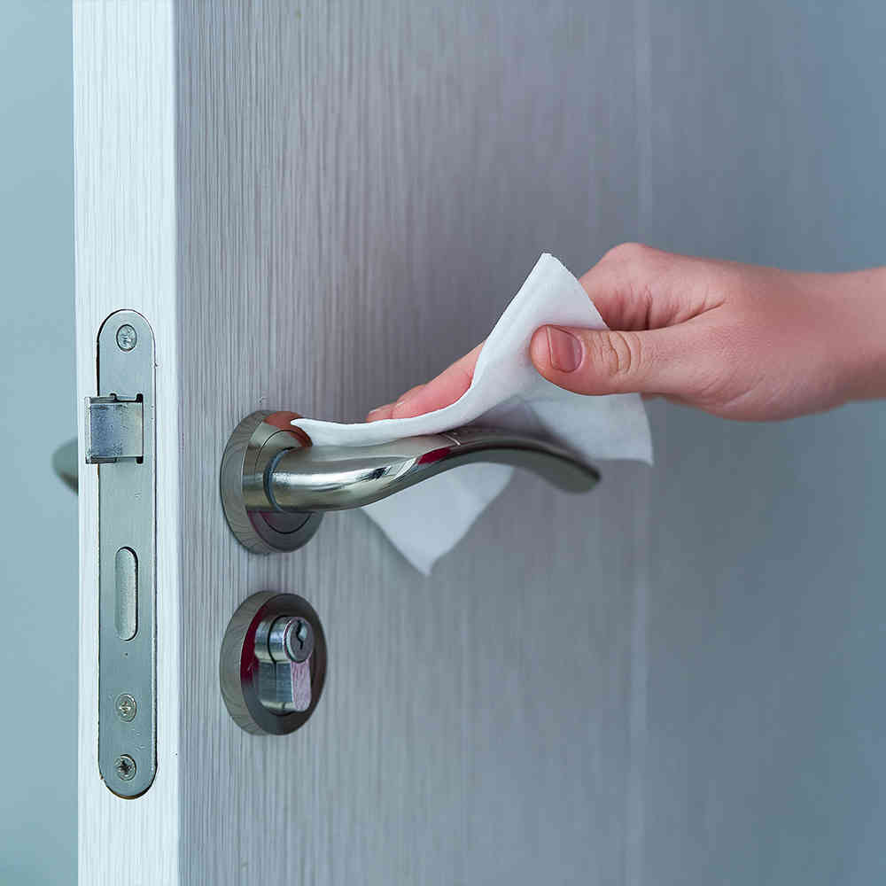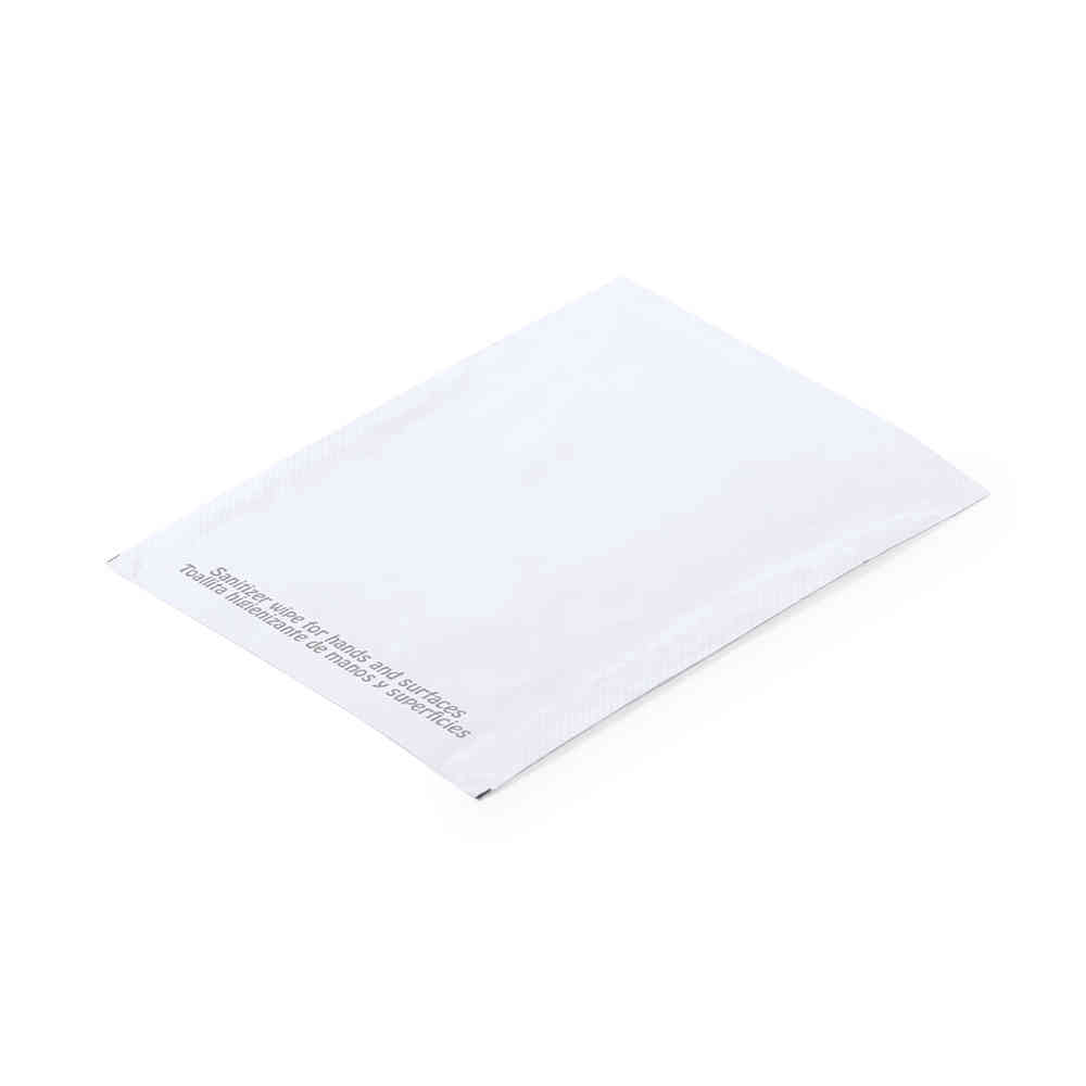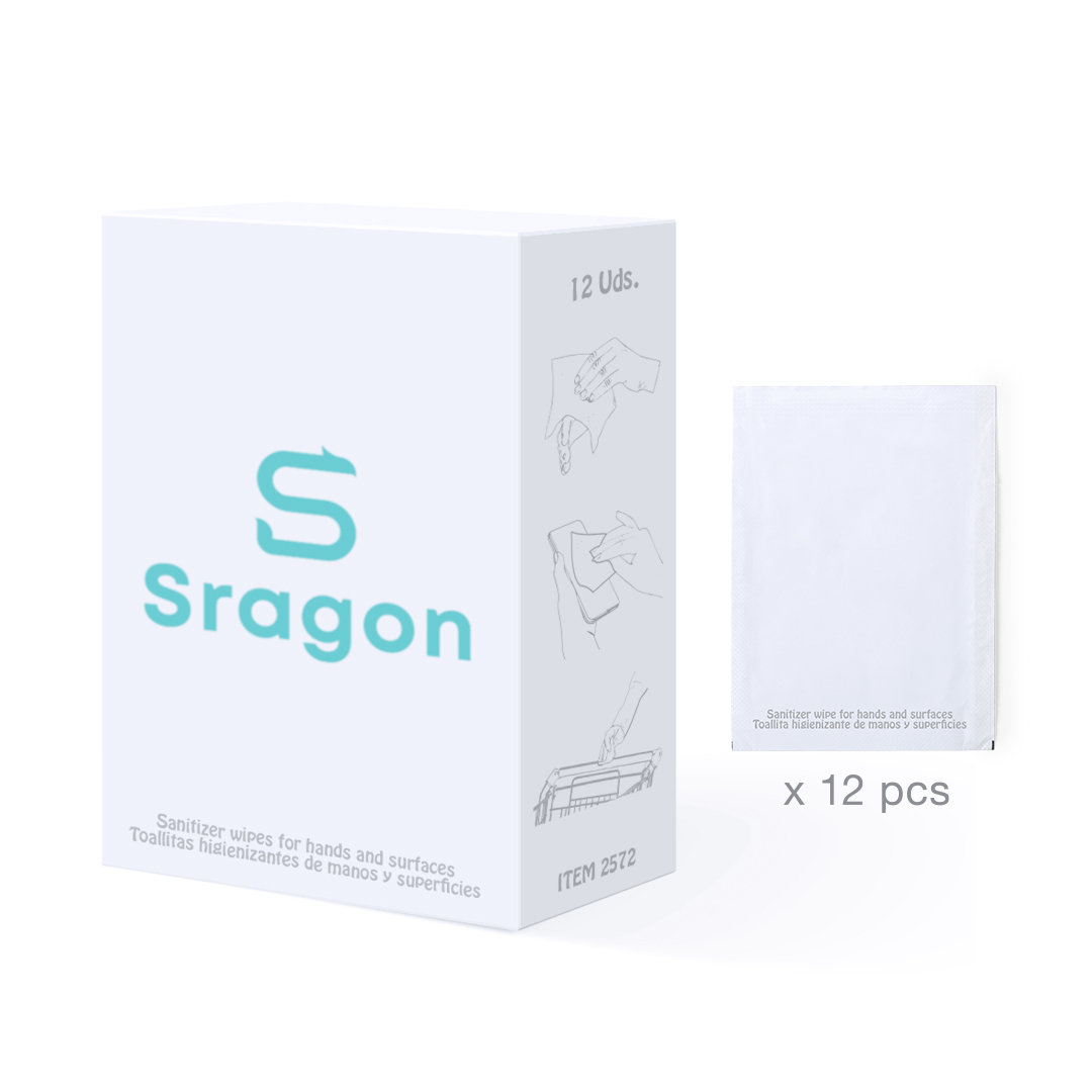 Conjunto de toalhitas húmidas higienizantes hidroalcoólicas para limpeza e desinfeção de mãos e superfícies de uso frequente (smartphones, barras do carrinho de compras, teclados...). Fabricadas em material compostável e apresentadas num estojo de 12 unidades. Monodoses de 2 ml, com ampla superfície para impressão.