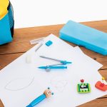 Conjunto escolar de geometria em caixa de PP. Contém 9 peças: 1 compasso, 1 borracha, 1 afiadeira, 1 lápis, 1 lapiseira, 10 minas de 0.5 mm, 1 régua, 1 esquadro e 1 transferidor.