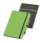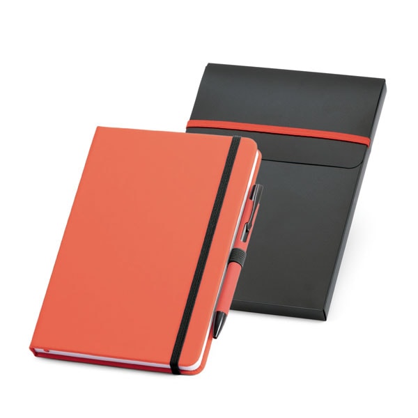 Conjunto de esferográfica e bloco de notas A5, em imitação de pele, com 160 páginas lisas. Conjunto personalizado é fornecido com caixa de oferta em PP.