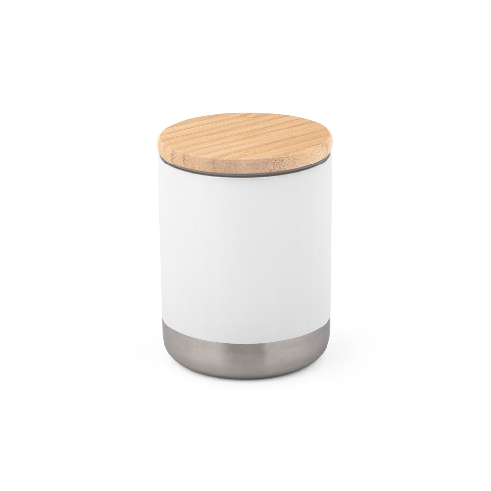Copo em aço inoxidável com parede dupla isolada a vácuo, parede interna revestida de cobre e tampa em bambu com vedante de silicone para proteção extra. O copo tem capacidade até 370 ml e mantém as bebidas quentes por 5 h e frias por 24 h. Este copo tem um revestimento em pó que lhe confere mais durabilidade e resistência. Fornecido em caixa oferta de papel craft.
