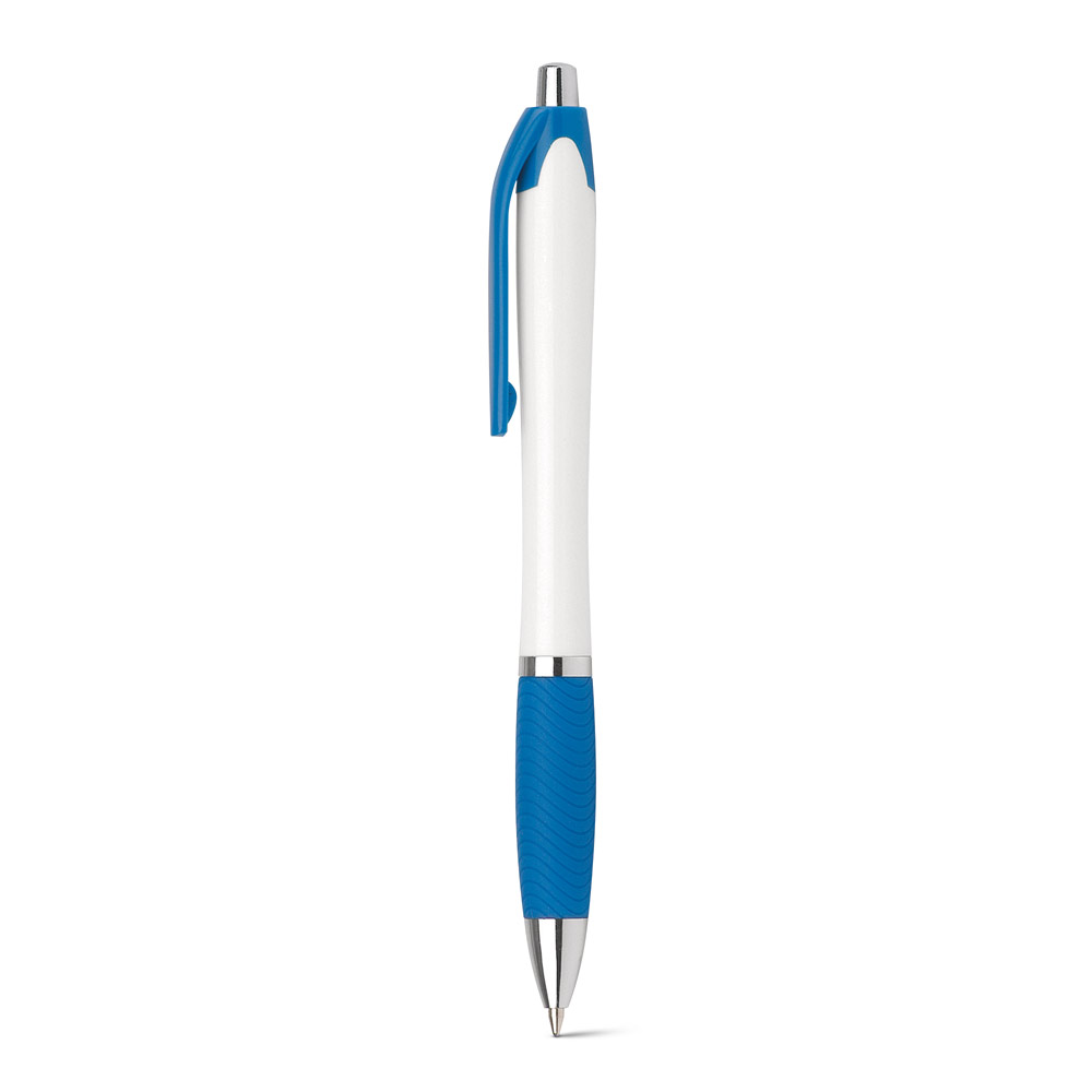 Esferográfica com apontamentos em prateado. Clipe e antideslizante disponíveis em várias cores. Escrita a azul.