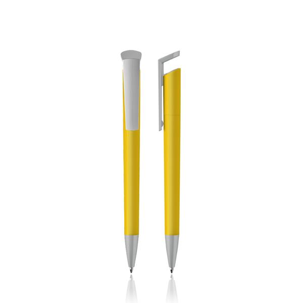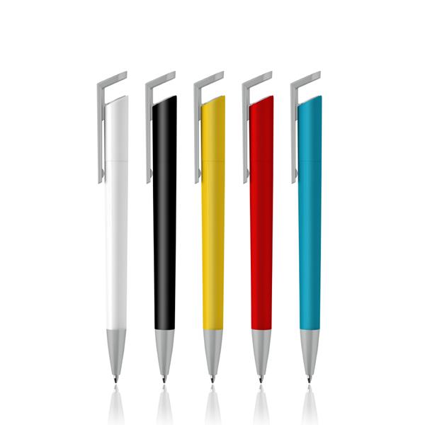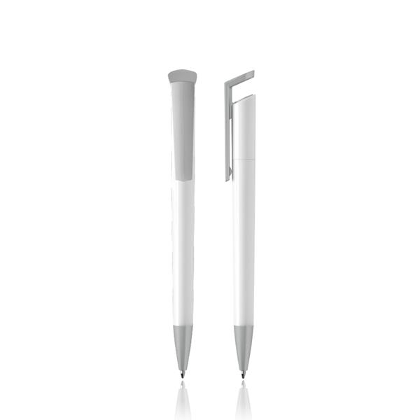 Esferográfica de plástico, detalhes cor cinza. Escrita azul, sistema pulsar. Com um clip diferente e moderno, esta esferográfica é ideal para expandir a sua marca e levá-la onde quiser.