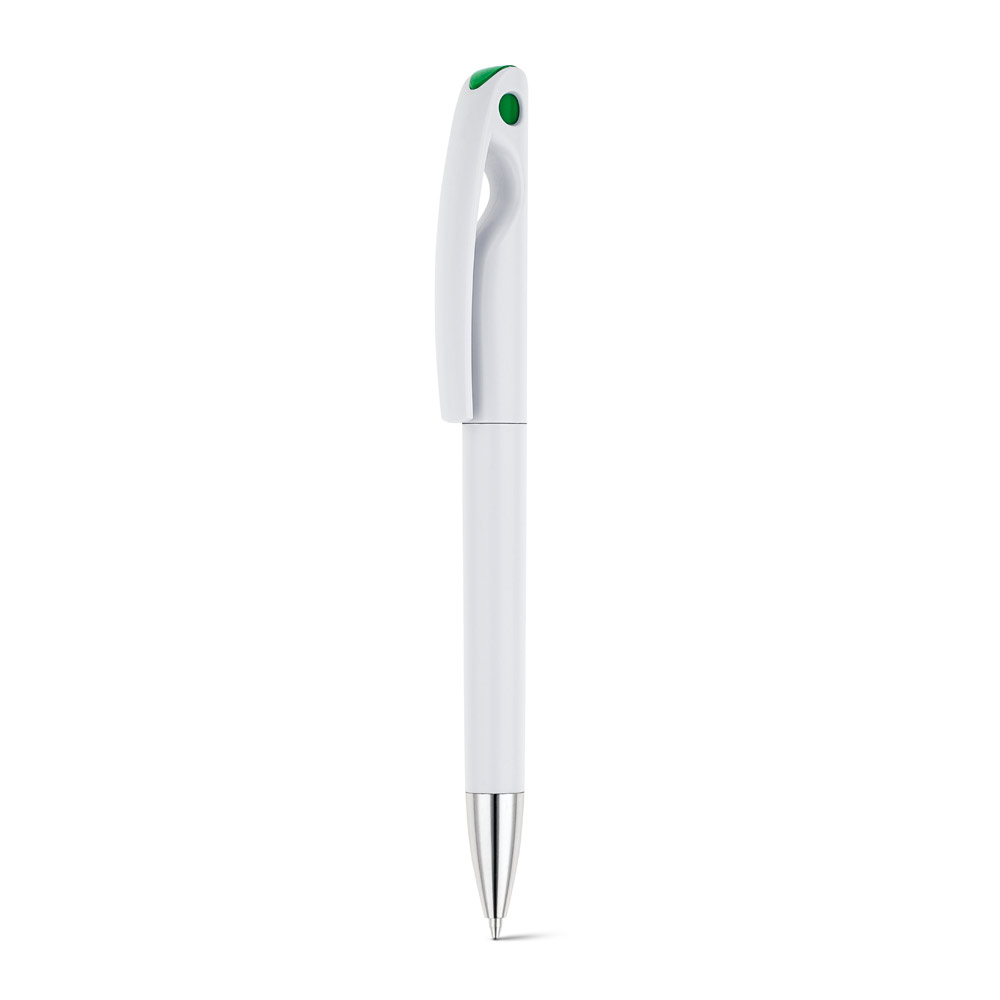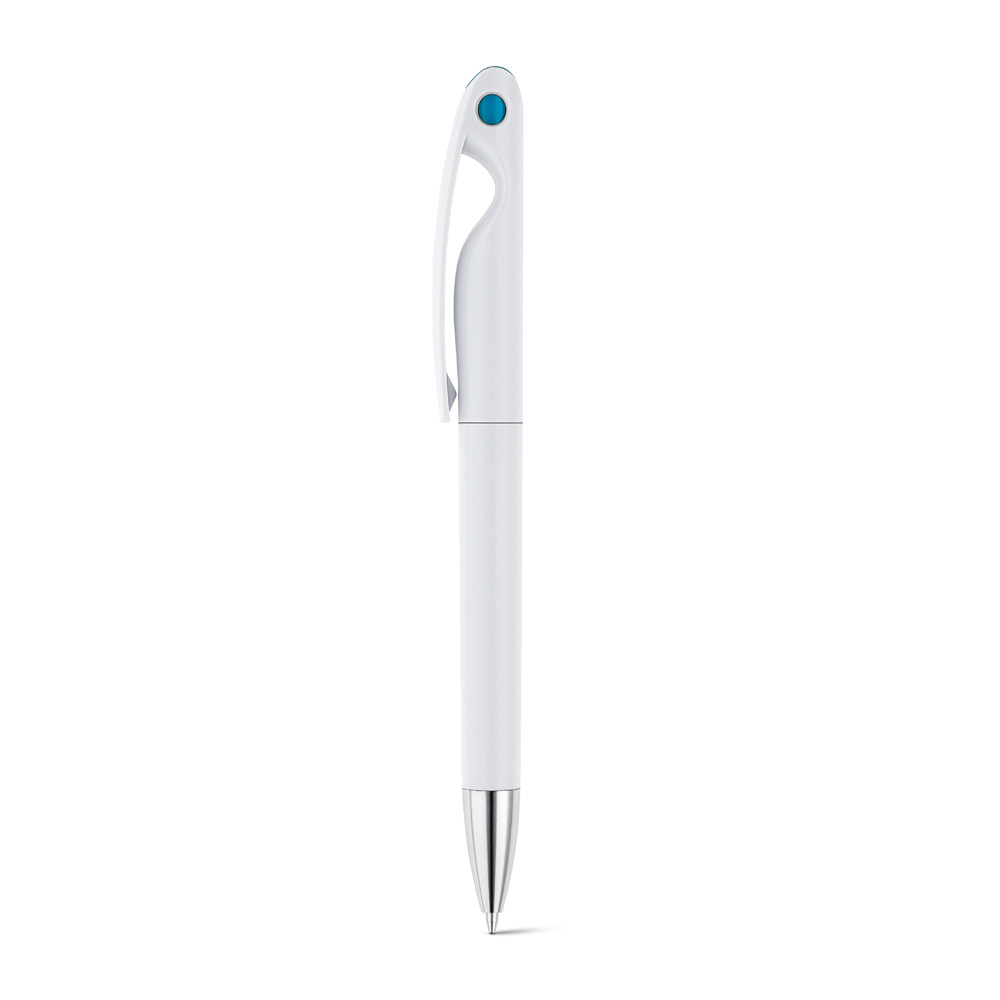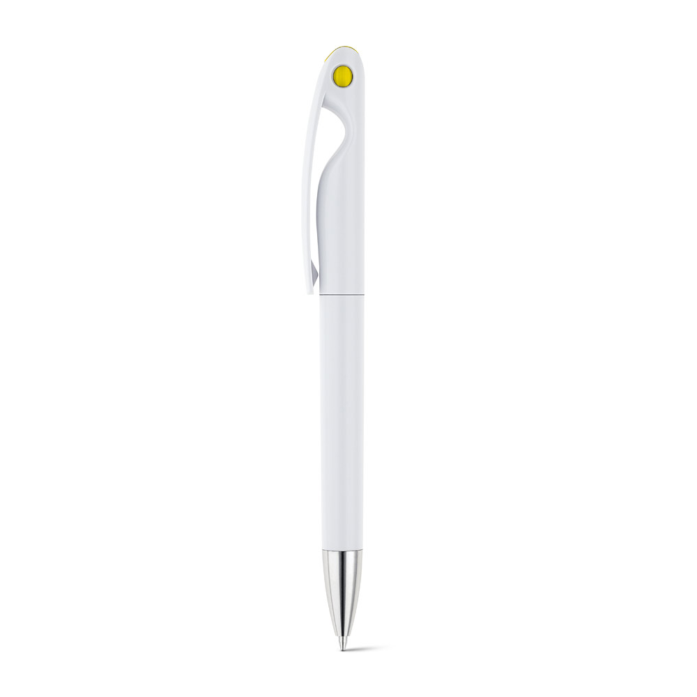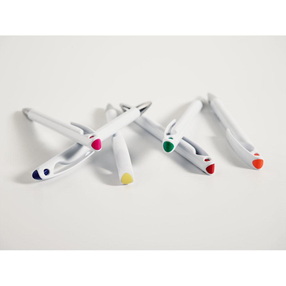 Esferográfica em ABS com detalhes coloridos. Escrita a preto.