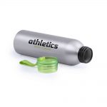 Garrafa em alumínio com capacidade de 650 ml. Corpo prateado, com tampa de rosca segura numa variedade de cores transparentes. Fita de transporte em TPR a condizer.