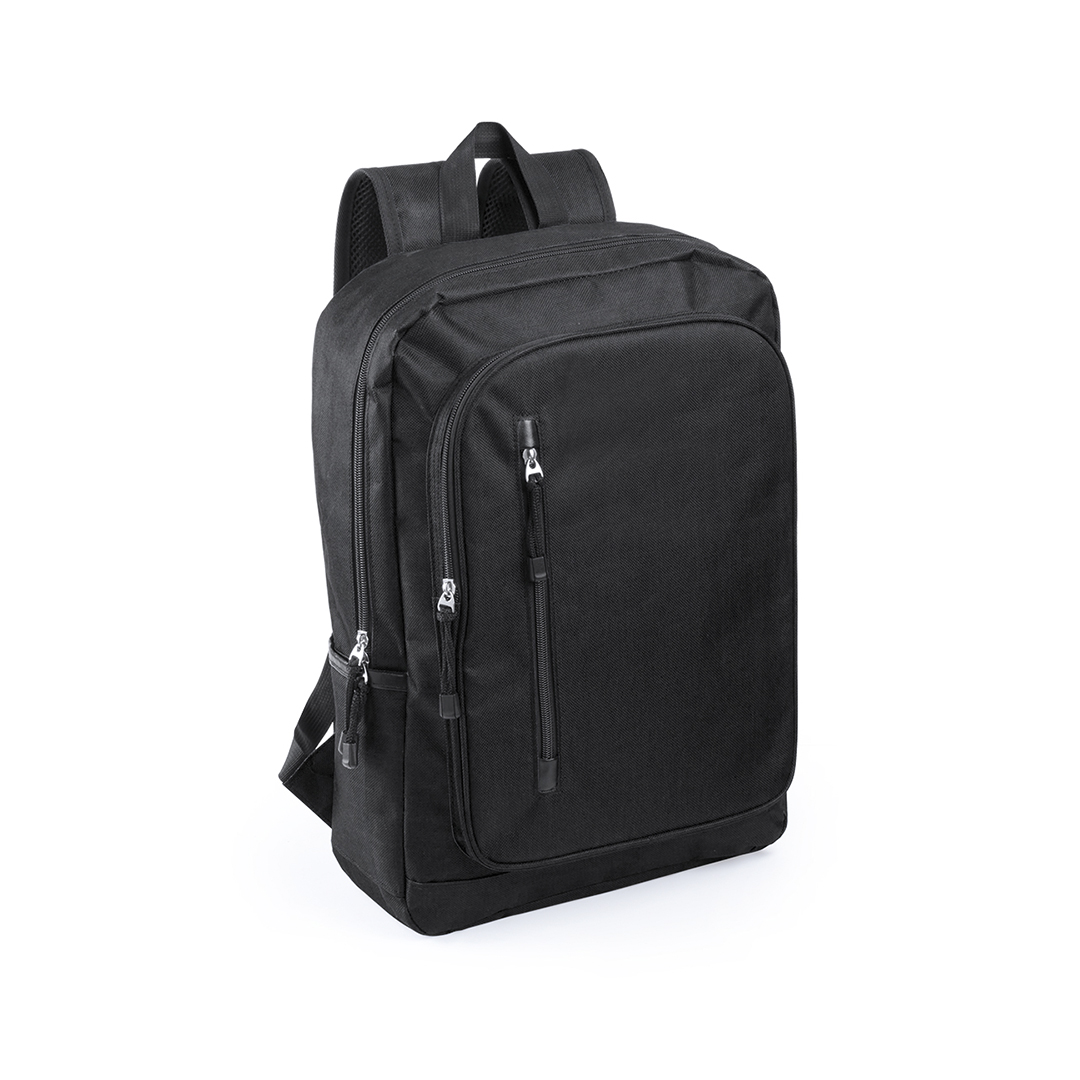 Mochila de poliéster 600D resistente com fecho e bolsos frontais. Em cores sóbrias, com costas e alças acolchoadas, compartimento acolchoado interior para portáteis até 15 polegadas e alças com tiras fácil abertura.