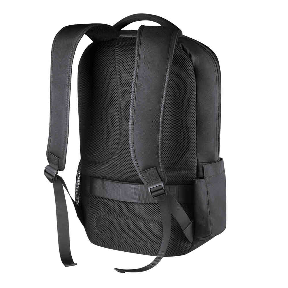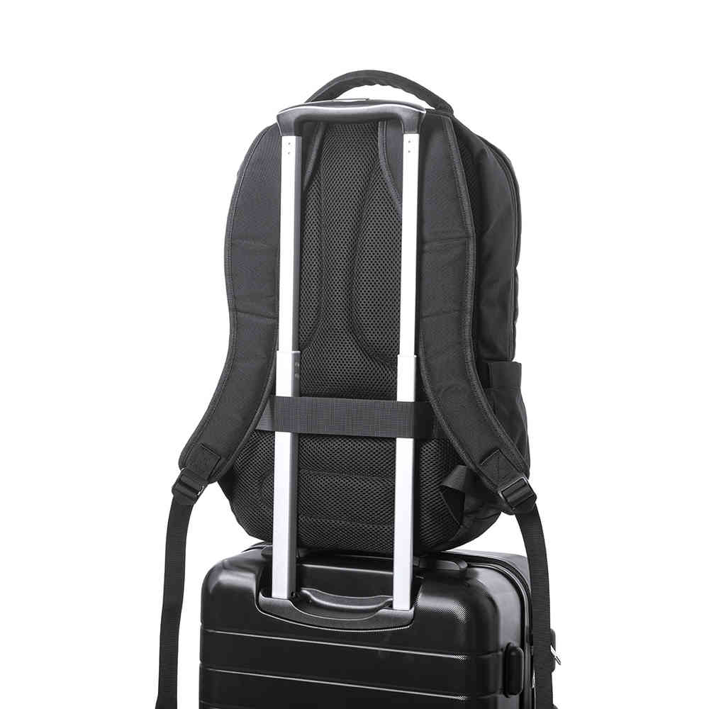 Mochila de alta qualidade em resistente nylon 1200D, de elegante acabamento em cor preta. Com original bolso exterior com fecho de correr e acessório para ajuste em trolley. Compartimentos interiores acolchoados para computador portátil de até 15 polegadas e tablets de até 12 polegadas. Fitas de ombros acolchoadas e costas com acolchoado ergonómico.
