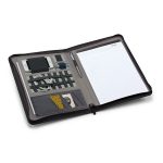 Pasta A4. Imitação de linho e imitação de pele. Bloco: 20 folhas pautadas. Placa metálica com acabamento em borracha. Esferográfica e acessórios não incluídos.