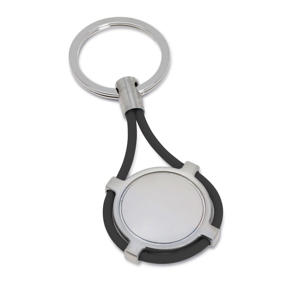 Porta-chaves redondo em metal e silicone. Fornecido em caixa de oferta.