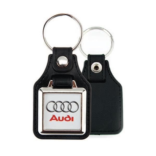 Porta-chaves MD-10 em metal com formato quadrado e revestimento em volta de pele. Com 1 face (25x25mm) para inserção de papel e tampa acrilica
