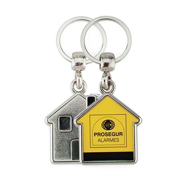 Porta-chaves MY em metal com formato de casa. Com 1 face para inserção de papel e fecha com uma tampa em acrílico