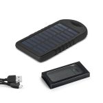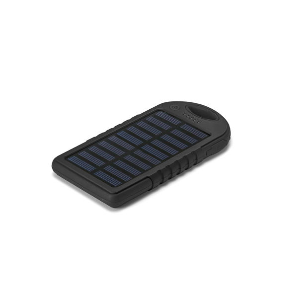 Bateria portátil. ABS. Acabamento em borracha. Com painel solar e LED. Bateria de lítio. Capacidade: 1.800 mAh. Tempo de vida ≥ 500 ciclos. Com entrada/saída 5V/1A e 2 portas USB. Inclui cabo USB/micro USB para carregar a bateria.