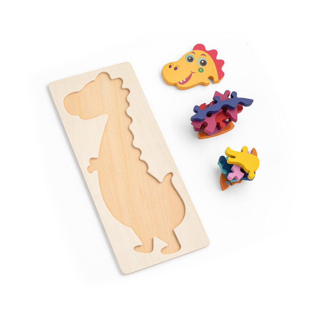 Puzzle em contraplacado de pinho em forma de dinossauro. Cada peça está numerada para ajudar na montagem. A base, também em contraplacado, é personalizável. Fornecido em caixa kraft.