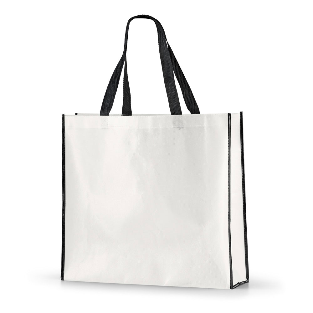Saco em non-woven laminado (120 g/m²) com alças webbing de 60 cm e com laminação brilhante.