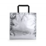 Saco em non-woven laminado de acabamento metálico. Disponível em dourado, prateado e dourado rosa. Com alças médias reforçadas de 42 cm de comprimento. Acabamento termo-selado. Resistência até 7kg de peso.