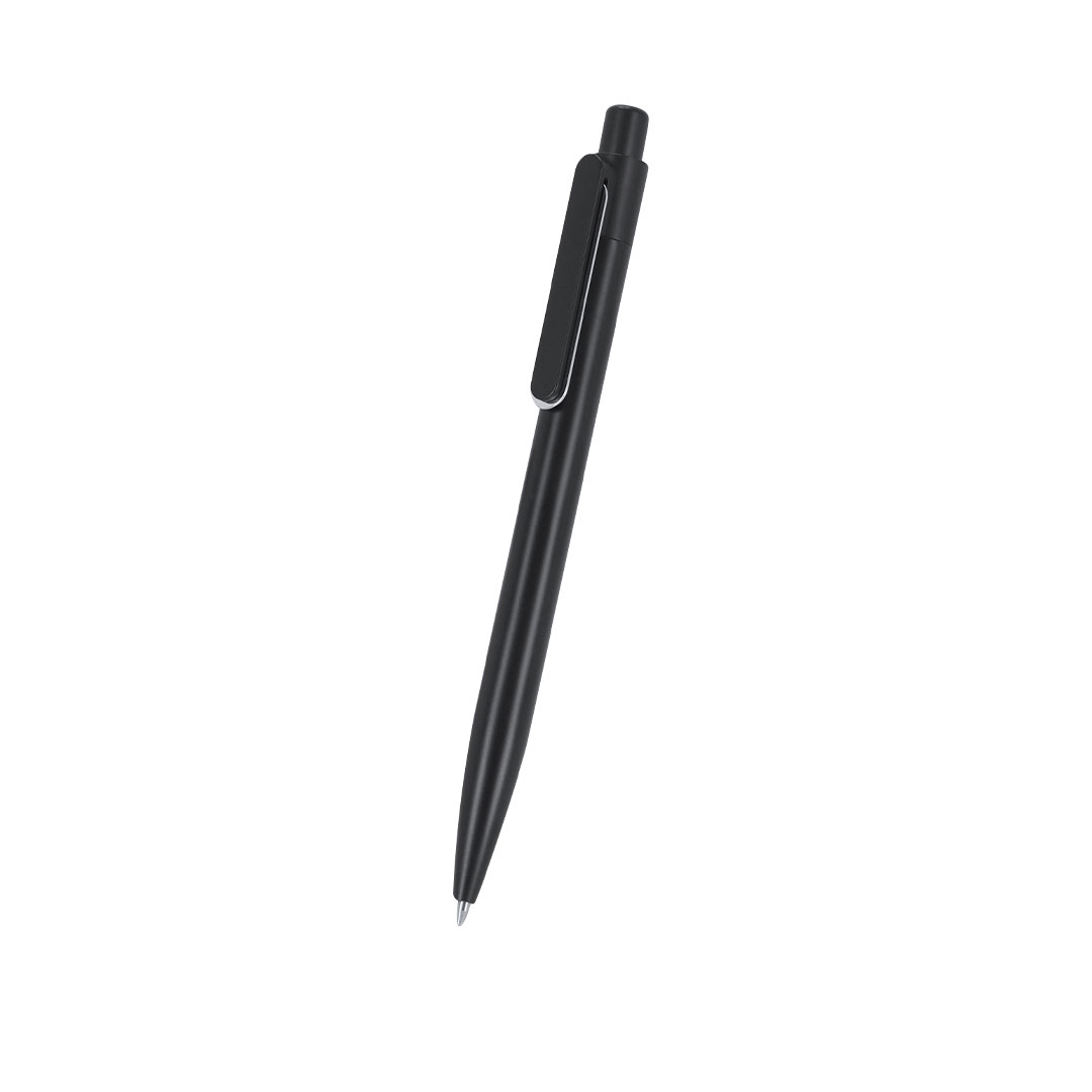Caneta com acabamento preto mate, mecanismo de botão, clip metálico e detalhe polido.