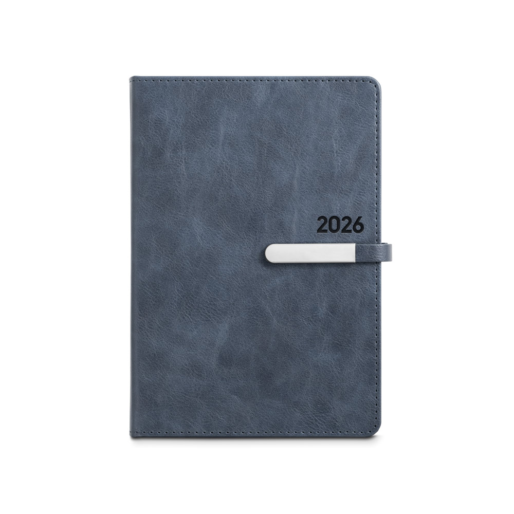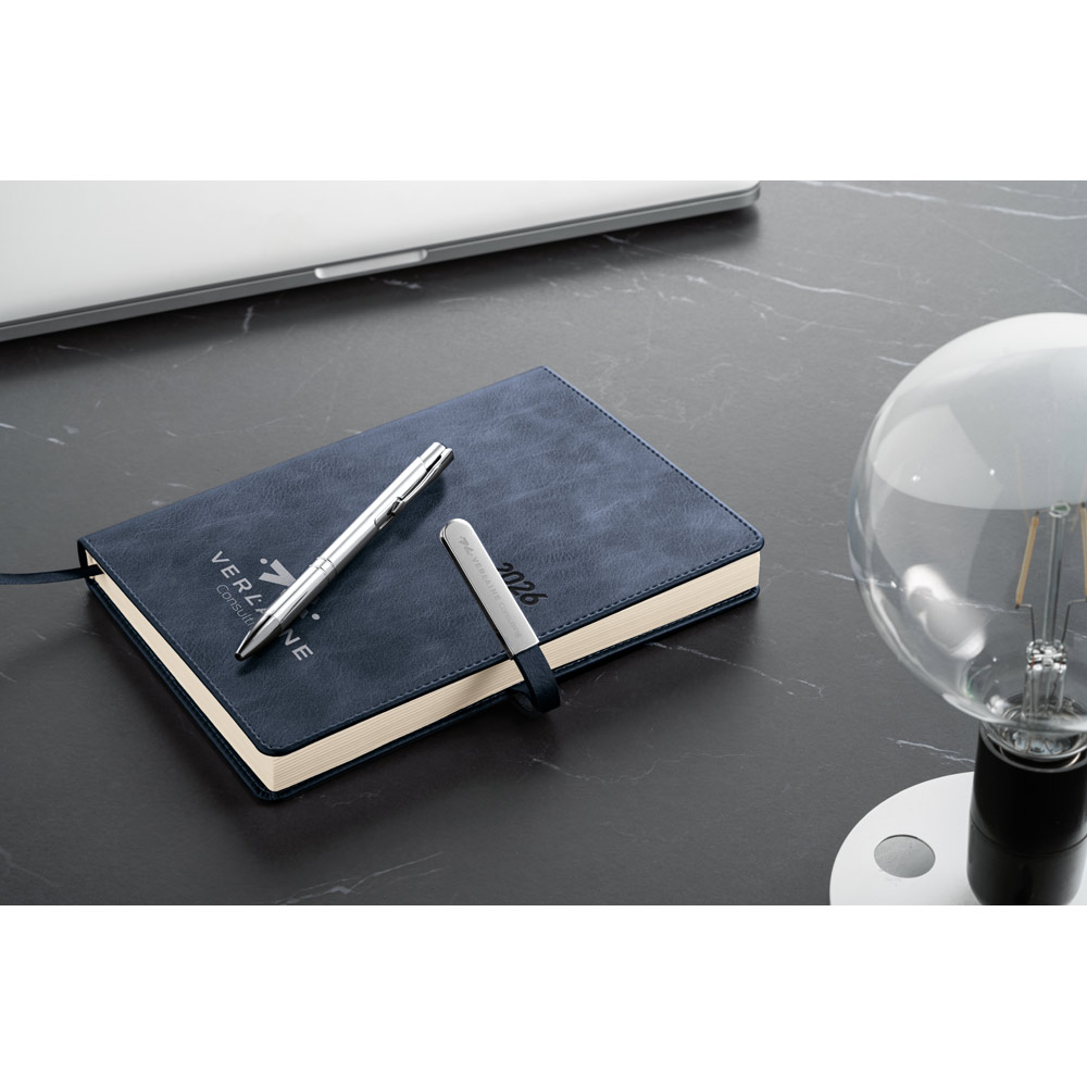 A VERLAINE A5 é uma agenda A5 em PU, com fecho magnético e peça metálica brilhante, oferecendo um design sofisticado e distinto.